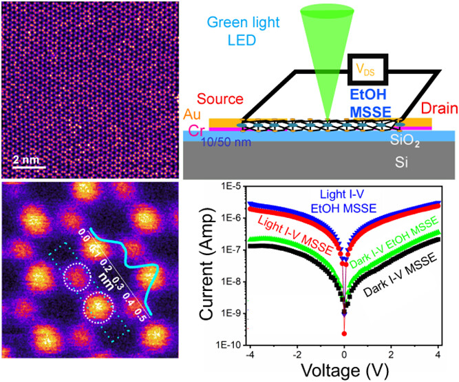 Two-dimensional semiconductor-transition-metal dichalcogenide (2D-STMD) based semiconductors have emerged as promising materials for future spintronic and optoelectronic applications, including photodetectors and transistors. Transferring high-quality chemical vapor deposition (CVD)-grown monolayer 2D-STMDs and their alloys to the target substrate is very challenging for fabricating efficient devices. Unfortunately, current post-transfer methods struggle to completely remove unwanted contamination residues during wet-transfer processes, which adversely affects material quality and intrinsic properties. In this work, the effect of ethanol cleaning on the qualitative and quantitative assessment of molecular adsorbates is demonstrated, based on atomic-resolution high-angle annular dark field scanning transmission electron microscopy (HAADF-STEM) image analysis supported by X-ray photoelectron spectroscopy (XPS), Auger electron spectroscopy (AES), and density functional theory (DFT) calculations, which showcases ultraclean material structures. We estimate the unidentified molecular adsorbates in the proximity of molybdenum (Mo) and chalcogen (S, Se) atomic sites, which are tentatively assigned as ‘C2H5OH (EtOH)’, ‘H2O’, and ‘O2’ related adsorbates. The attribution is based on HAADF-STEM Gaussian line shape fitting of atomic intensity columns and corresponding computed adsorption energy values after ethanol treatment of the MoS2(1–x)Se2x (MSSE) alloy. In line with experimental observations of persistent OH-containing residues on the surface, DFT simulations show that EtOH has better adsorption on both pristine and sulfur-vacancy MSSE monolayers than H2O and O2. Photodetector device measurements revealed a remarkable ∼90% enhancement in photocurrent values for ultraclean samples, significantly boosting the material’s photoresponsivity. DFT calculations on the adsorption energy and density of electronic states were also conducted to validate our experimental findings.